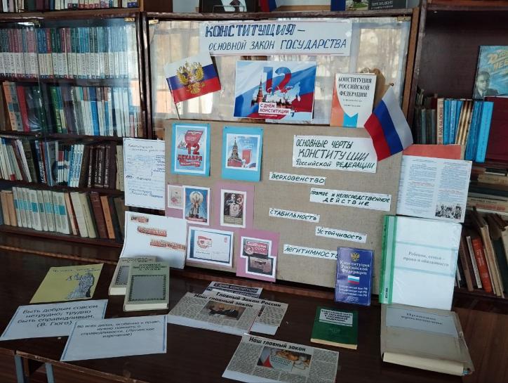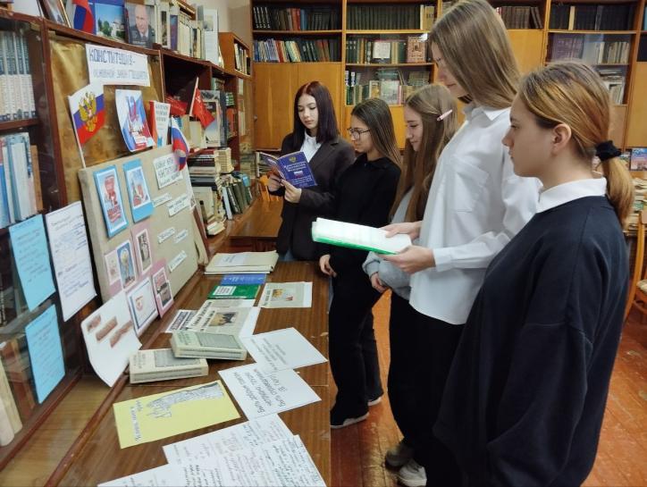 В рамках празднования Дня Конституции Российской Федерации в библиотеке школы представлена выставка «Конституция:наш главный закон», где учащиеся обсудили важные моменты развития законодательства в России, создания Конституции РФ. Педагог-библиотекарь провела захватывающую интеллектуальную викторину, посвященную основному закону нашей страны. Мероприятие собрало учащихся средних и старших классов, на котором ребята передали свое понимание статей Конституции, прав и обязанностей гражданина.